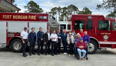 March 16, 2026 Checks were presented to the three Gulf Coast Fire Departments. Checks were in the Amount of $1,900 to each Fire Department and an additional $50 check was donated to the Gulf Shores Fire Department by a winning Wisconsin Snobird. Pictured: Fort Morgan Fire Fighters, Noel Kaid, Colry Smith, Daron Hacer, Fort Morgan Fire Chief Lee Steiner, Tom & Becky Heidenreich In, Nancy & Jeff Poferl MN, Theresa Mills MI, Frank & Tracy Panczyszyn NY, Orange Beach Deputy Chief Robert Simpson, Gulf Shores Fire Deputy Chief Robert Rowland, and Kenn Krouse, WI.